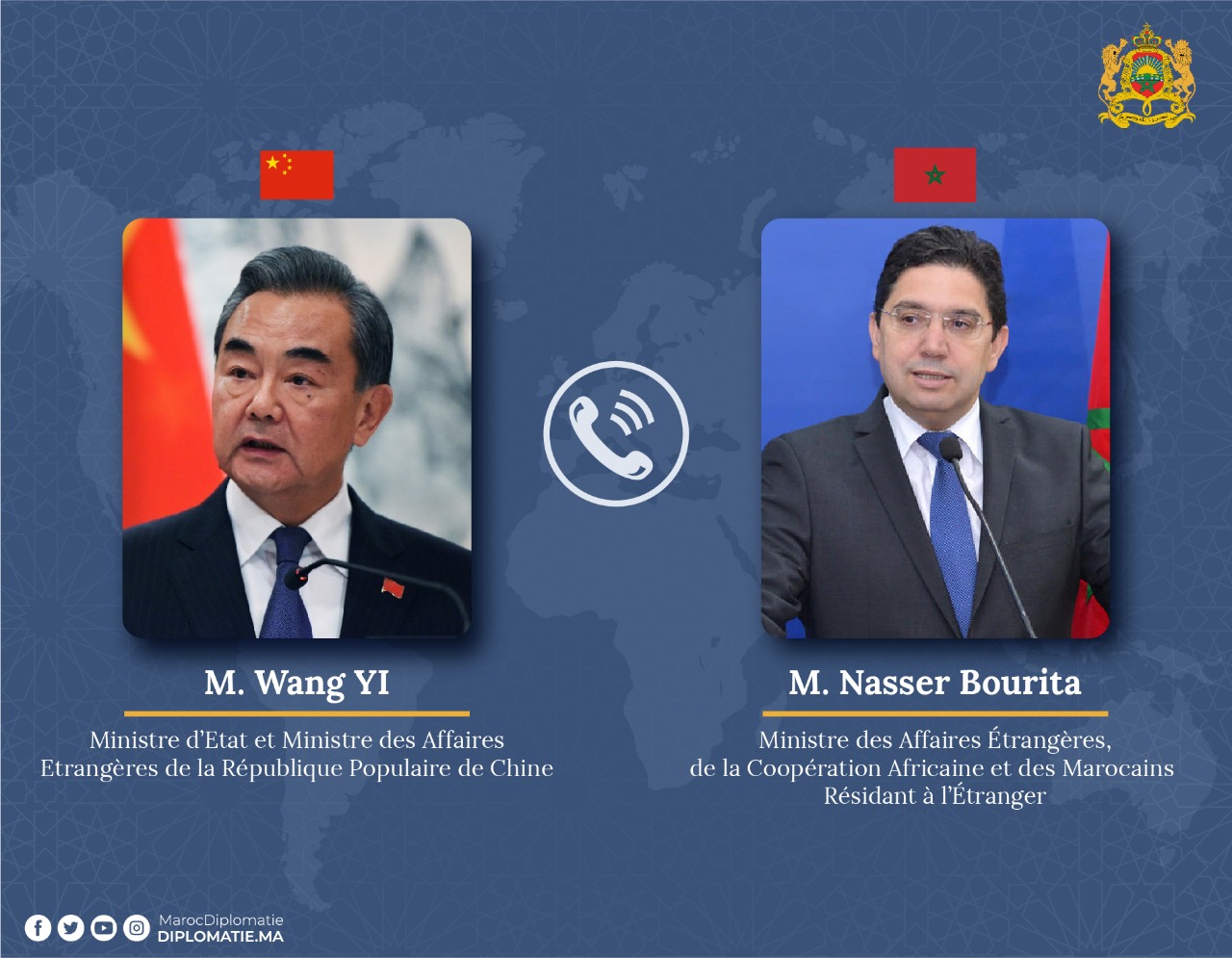 أجرى وزير الشؤون الخارجية والتعاون الإفريقي والمغاربة المقيمين بالخارج، ناصر بوريطة، اليوم الخميس، اتصالا هاتفيا مع وزير الدولة وزير الشؤون الخارجية لجمهورية الصين الشعبية ، وانغ يي.