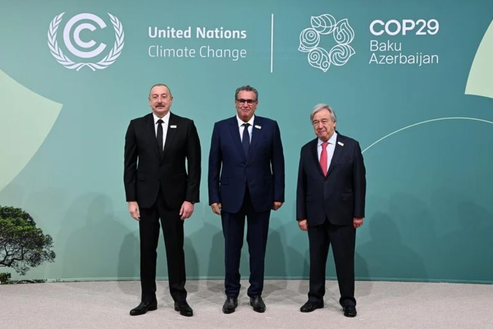 استقبل رئيس جمهورية أذربيجان، إلهام علييف، والأمين العام للأمم المتحدة، أنطونيو غوتيريش، اليوم الثلاثاء بالملعب الأولمبي في باكو، رئيس الحكومة عزيز أخنوش، الذي يترأس الوفد المغربي المشارك في الدورة التاسعة والعشرين لمؤتمر الأطراف في اتفاقية الأمم المتحدة الإطارية بشأن تغير المناخ (كوب 29) المنعقدة بأذربيجان.