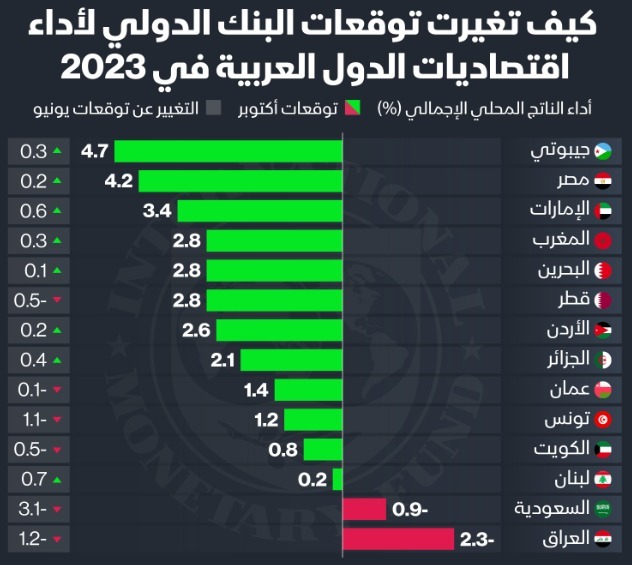 توقع البنك الدولي في أكتوبر حدوث تغيرات في أداء اقتصادات بعض الدول العربية لسنة 2023، مقارنةً بتوقعات يونيو الماضي، وذلك استنادا إلى أداء الناتج المحلي الإجمالي.