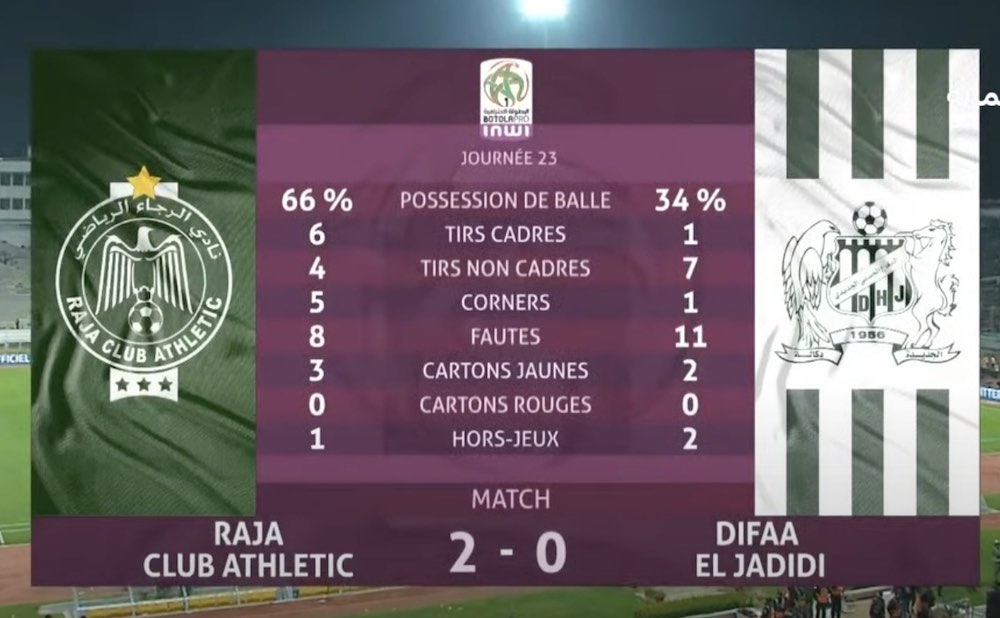 فاز فريق الرجاء الرياضي على ضيفه فريق الدفاع الحسني الجديدي بهدفين للاشيء، في المباراة التي جمعتهما ،مساء اليوم الجمعة، على أرضية المركب الرياضي محمد الخامس بالدار البيضاء، برسم الدورة ال23 من البطولة الوطنية الاحترافية “إنوي” لكرة القدم.