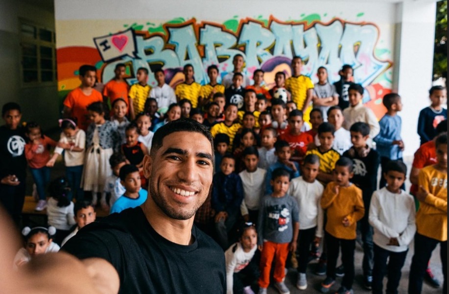 احتفل أشرف حكيمي، اللاعب الدولي المغربي لكرة القدم في نادي باريس سان جيمان، بعيد الفطر مع أطفال إحدى الجمعيات الخيرية في مدينة الدار البيضاء.