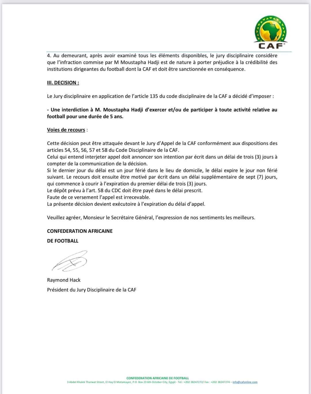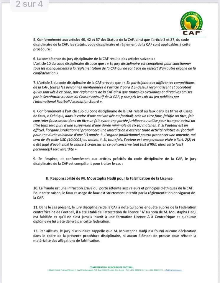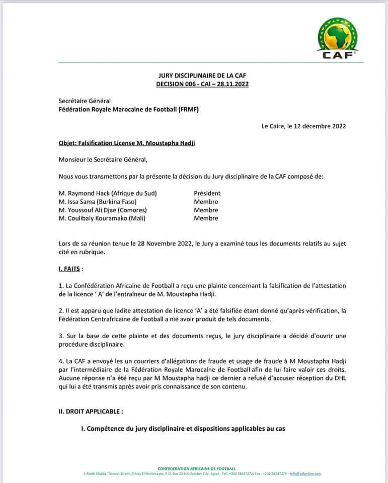 وأشار الاتحاد الإفريقي في بلاغه، إلى أنه بعد تحقيقه في رخصة تدريب مصطفى حجي، الصادرة عن اتحاد إفريقيا الوسطى لكرة القدم، تبين لها أنها مزورة، وأن اتحاد إفريقيا الوسطى، لم يقدم أي تكوين في التدريب لنيل رخصة التدريب صنف “A”، ولم يصدر عنه أي رخصة تدريب في هذا الصنف.