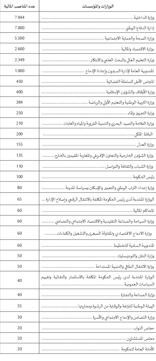 وحسب ما جاء في المذكرة التقديمية لمشروع قانون مالية سنة 2024، تم تخصيص 29 ألفا و534 منصبا ماليا لفائدة الوزارات والمؤسسات العمومية، وهمت معظم هذه المناصب وزارة الداخلية بعدد 7 آلاف و944 منصبا ماليا، وإدارة الدفاع الوطني بـ7 آلاف منصب مالي، ووزارة الصحة والحماية الاجتماعية بـ5 ألاف و500 منصب مالي ووزارة الاقتصاد والمالية بألفين و600 منصب مالي، فضلا عن وزارة التعليم العالي والبحث العلمي والابتكار بألفين و349 منصبا ماليا والمندوبية العامة لإدارة السجون وإعادة الإدماج بألف منصب مالي. فيما تتوزع باقي المناصب على باقي القطاعات الوزارية والمؤسسات التابعة لها.