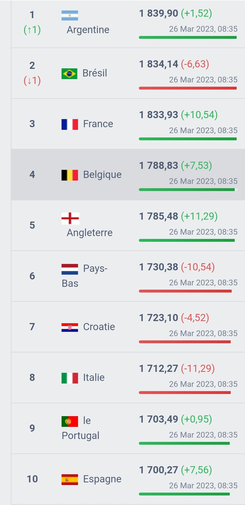 وفقد المنتخب البرازيلي 6.63 نقاط من رصيده ليستقر في 1834.14 نقطة،في حين عزز زملاء ميسي رصيدهم بـ1.52 نقطة، بعد الفوز وديا على بنما، ليتجاوزوا البرازيل بمجموع 1839.90 نقطة.