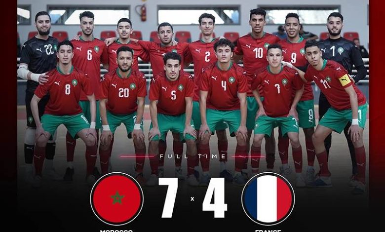 فاز المنتخب الوطني المغربي لكرة القدم داخل القاعة، لأقل من 23 سنة، على نظيره الفرنسي بنتيجة 7 أهداف لـ4 ، وذلك في المباراة الودية التي جمعتهما اليوم الخميس 2 مارس 2023، بمركب محمد السادس لكرة القدم المعمورة.