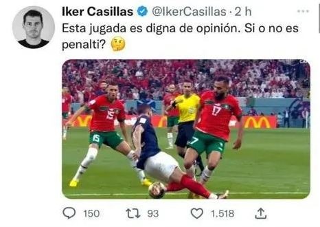 وتفاعل كاسياس مع أحداث مباراة المغرب وفرنسا، عبر وسائل التواصل الاجتماعي، متوقفا عند ركلة جزاء المغرب الخاصة باللاعب، سفيان بوفال، التي لم يحتسبها الحكم لصالح العناصر الوطنية.