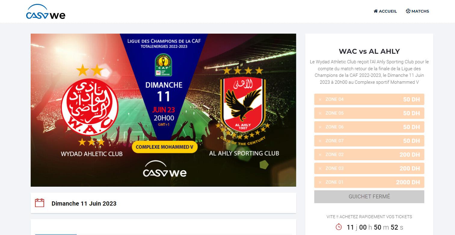 أعلنت الشركة المكلفة “كازا إيفنت” الأربعاء 31 ماي عن طرح تذاكر قمة إياب نهائي دوري أبطال إفريقيا الذي سيجمع نادي الوداد بالأهلي المصري يوم الأحد 11 يونيو على أرضية ملعب محمد الخامس بالدار البيضاء.