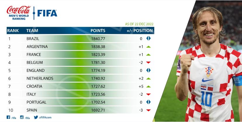 وبفضل التأهل إلى المربع الذهبي، حققت كرواتيا (7، 5+) والمغرب (11، 11+) قفزتين مذهلتين في التصنيف العالمي. حيث وقعت أسود الأطلس على “تقدم العام” من خلال حصدها 142 نقطة خلال الـ 12 شهرًا الماضية.