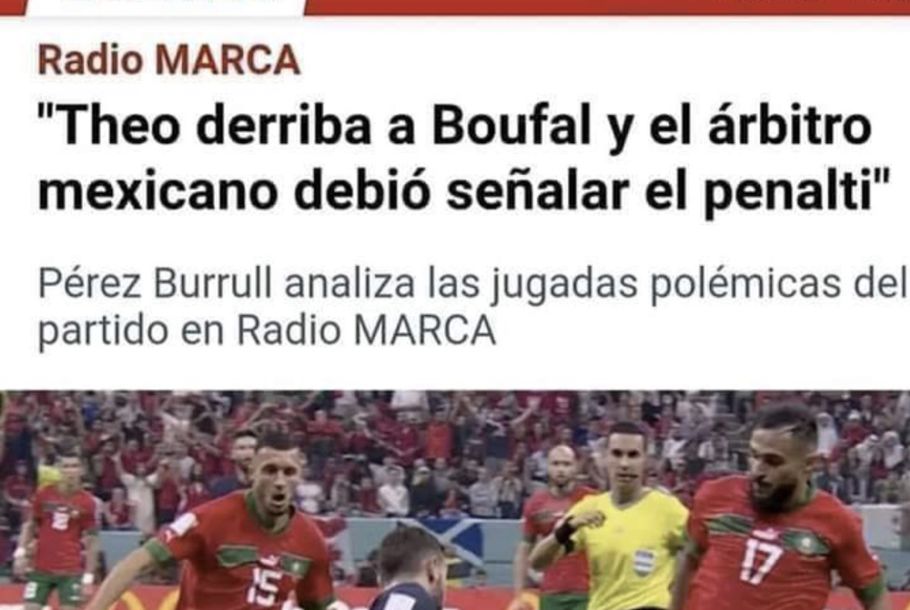 وعنونت صحيفة ماركا بعد تأهل فرنسا للمباراة النهائية للعب ضد الأرجنتين، يوم الأحد 18 دجنبر الجاري، «ثيو عرقل بوفال، والمكسيكي رفض احتساب ركلة جزاء».