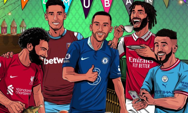 واختارت صفحة البريمرليغ كلا من حكيم زياش ونايف أكرد ومحمد صلاح والنني ومحرز، كي تهنئ الشعوب الإسلامية بمقدم عيد الفطر، معززة كلمتي “عيد مبارك”، بهلال، وحلويات، وبراد شاي أحمر، يتكفل بتقديمه محتواه النجم محمد صلاح.