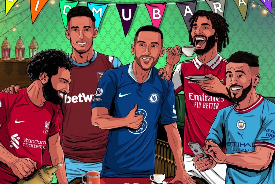 واختارت صفحة البريمرليغ كلا من حكيم زياش ونايف أكرد ومحمد صلاح والنني ومحرز، كي تهنئ الشعوب الإسلامية بمقدم عيد الفطر، معززة كلمتي “عيد مبارك”، بهلال، وحلويات، وبراد شاي أحمر، يتكفل بتقديمه محتواه النجم محمد صلاح.