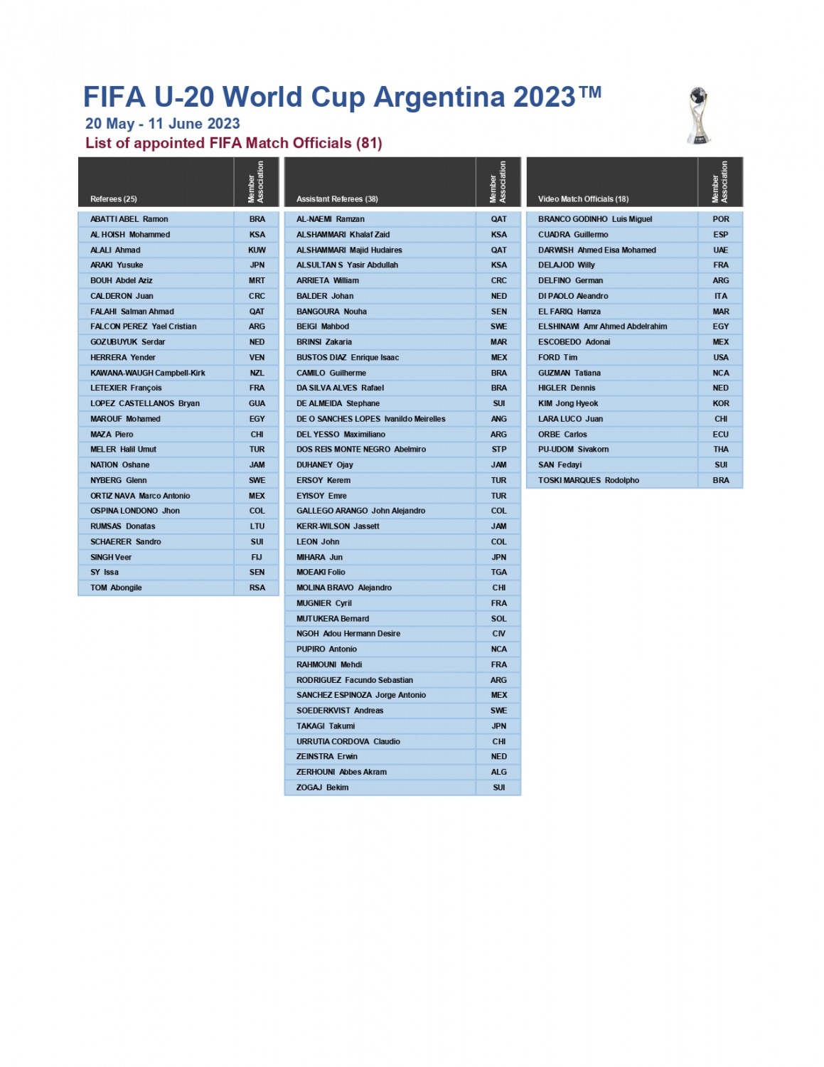 كشف الاتحاد الدولي لكرة القدم “فيفا”، الخميس 20 أبريل 2023، قائمة الحكام الـ81 التي اختارها للمشاركة في قيادة مباريات نهائيات كأس العالم لأقل من 20 سنة، المرتقبة في دولة الأرجنتين، في الفترة الممتدة ما بين 20 ماي و20 يونيو 2023.