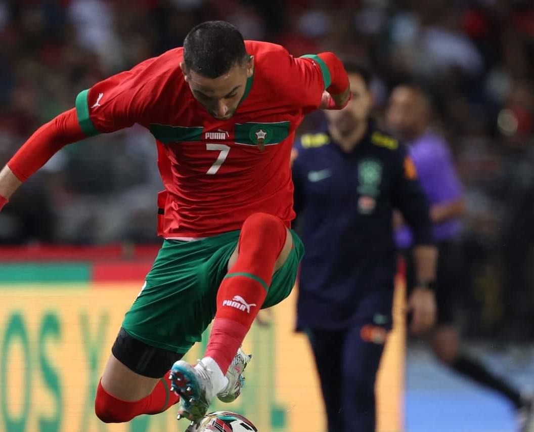 وجاء في التدوينة، التي علت صورة للدولي المغربي وهو يراوغ كاسميرو، في واحدة من أجمل لقطات المباراة، في ملعب طنجة الكبير، مساء السبت 25 مارس 2023، ما يلي:”ساحرنا حكيم زياش يشارك في فوز أسود الأطلس أمام البرازيل بهدفين مقابل هدف وديًا”.