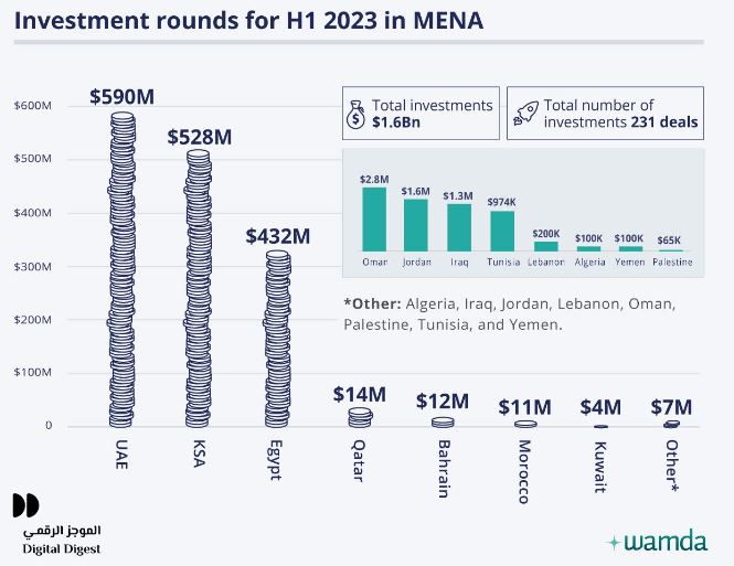 ووفقًا لبيانات “ومضة” أيضًا، تمكنت 45 مقاولة ناشئة في منطقة الشرق الأوسط وشمال أفريقيا من الحصول على تمويل في نهاية يونيو 2023 بمبلغ إجمالي قدره 35.6 مليون دولار، بما في ذلك مقاولتان في المغرب، بقيمة 150 ألف دولار. وتصدرت المملكة العربية السعودية بـ 25 مليون دولار من الاستثمارات التي جمعتها 20 مقاولة ناشئة، متبوعة بالإمارات (12 مقاولة ناشئة / 5 ملايين)، ومصر (5 مقاولات ناشئة / 4.8 ملايين).